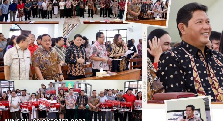 TONDANO, identitasnews.id – Wakil Gubernur Sulut Pnt Drs Steven O. E. Kandouw didampingi istri tercinta Ny dr Devi Kartika Kandouw-Tanos MARS, bersama Penjabat Bupati Minahasa, Pnt Dr Jemmy S. Kumendong MSi menghadiri ibadah syukur bersama jemaat GMIM Tiberias Kumu, kecamatan Tombariri, kabupaten Minahasa, Minggu (29/10/2023).