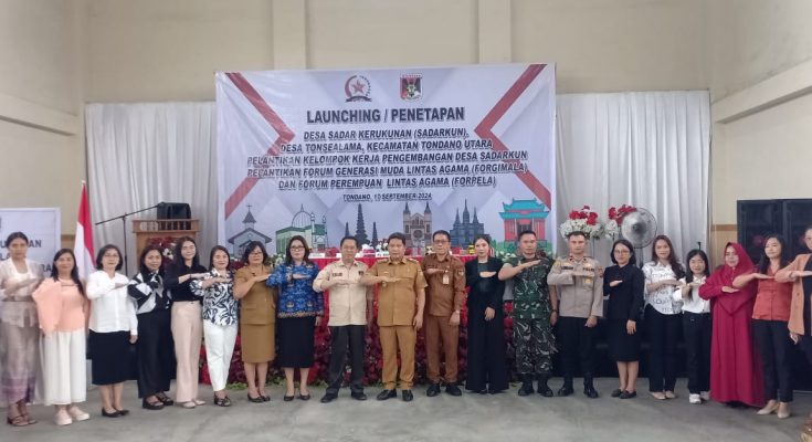 TONDANO, identitasnews.id – Penjabat Bupati Minahasa Dr. Jemmy Stani Kumendong M,Si, menghadiri dan melaunching Penetapan Desa Sadar Kerukunan (Sadarkun) Desa Tonsealama Kecamatan Tondano Utar yang dirangkaikan Pelantikan Kelompok Kerja Pengembangan Desa Sadarkun, Pelantikan Forum Generasi Muda Lintas Agama (Forgimala) dan Forum Perempuan Lintas Agama (Forpela)