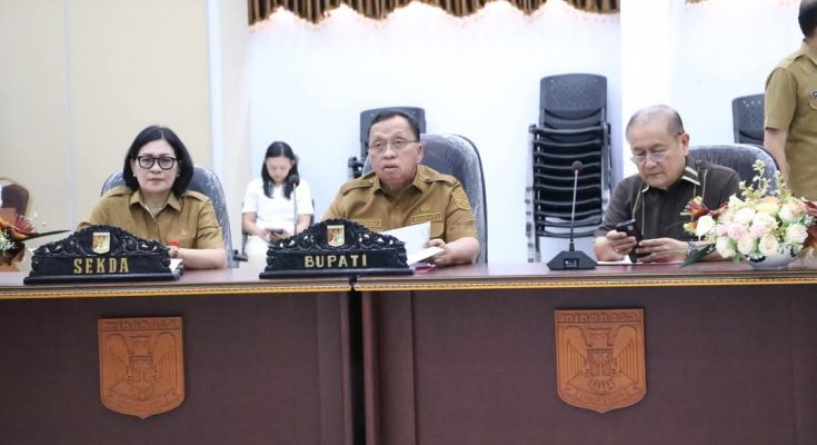 TANDANO, identitasnews.id – Bupati Minahasa, Robby Dondokambey, S.Si, MAP, didampingi Ketua DPRD Kabupaten Minahasa Drs. Robby Longkutoy, MM, dan Sekretaris Daerah Dr. Lynda D. Watania, MM, M.Si, mengikuti Rapat Koordinasi (Rakor) Tim Pengendalian Inflasi Daerah (TPID) yang dirangkaikan dengan Sosialisasi Penyelenggaraan Sekolah Unggulan Garuda. Kegiatan ini berlangsung di Ruang Sidang Kantor Bupati Minahasa, Senin (14/4/2025).
