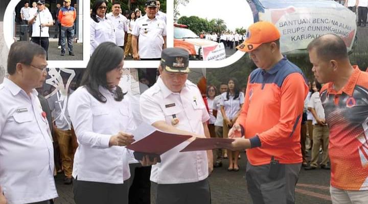 TONDANO, identitasnews.id – Bupati Minahasa Dr Jemmy S Kumendong M.Si didampingi Sekda Minahasa Dr Lynda Watania MM, melepas bantuan sosial (Bansos) Pemkab Minahasa untuk korban bencana alam letusan gunung