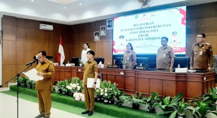 TONDANO, identitasnews.id – Bupati Minahasa, Robby Dondokambey, secara resmi melantik jajaran pengurus Forum Kerukunan Umat Beragama (FKUB) Kabupaten Minahasa periode terbaru. Prosesi pelantikan ini berlangsung khidmat di Ruang Sidang Kantor Bupati Minahasa, Tondano.
