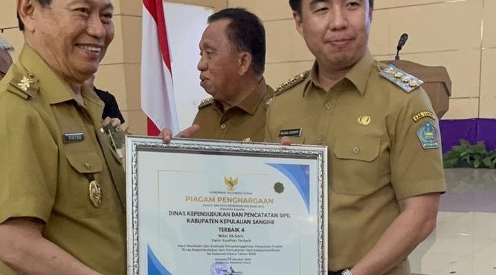 Selain itu, Kepala Dinas Kependudukan dan Pencatatan Sipil Daerah Kabupaten Kepulauan Sangihe juga meraih penghargaan sebagai terbaik ke-4 dengan nilai 85,79, hasil penilaian kinerja Pejabat Tinggi Pratama Dinas Dukcapil Kabupaten/Kota semester I tahun 2025 yang ditetapkan melalui Keputusan Menteri Dalam Negeri Republik Indonesia.