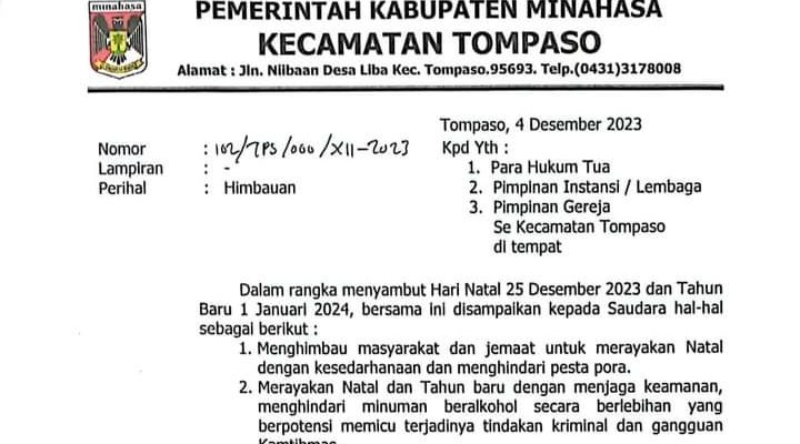 TOMPASO, identitasnews.id – Camat Tompaso Stenly D Umboh SSTP MAP, mengeluarkan surat himbauan dalam rangkah menyambut perayaan Natal 25 Desember 2023 dan menyongsong Tahun Baru 1 Januari 2024. Surat bertanggal 4 Desember 2023 ini ditanda tangani langsung oleh sang Camat dan tembusannya salah satu Bupati Minahasa.