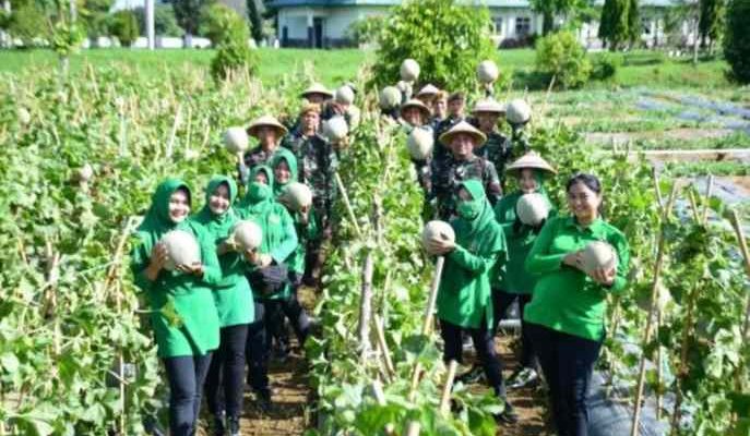 Komandan Batalyon Artileri Medan (Danyonarmed) 19/Bogani Mayor Arm Dony Romansah didampingi para perwira Yonarmed 19/Bogani beserta pengurus Persit Kck Cabang LXVI Yonarmed 19/Bogani PD XIII/Merdeka menggelar panen dari hasil budidaya tanaman ketahanan pangan dari buah Melon yang dilaksanakan oleh Batalyon Armed 19/105 Tarik Bogani Bolaang mongondow.