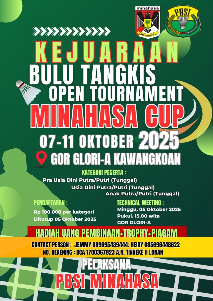 KAWANGKOAN, identitasnews.id – Persatuan Bulu Tangkis Seluruh Indonesia (PBSI) Kabupaten Minahasa, mulai 7-11 Oktober 2025 akan mengelar Kejuaraan Bulu Tangkis Open Tournament Minahasa Cup 2025.