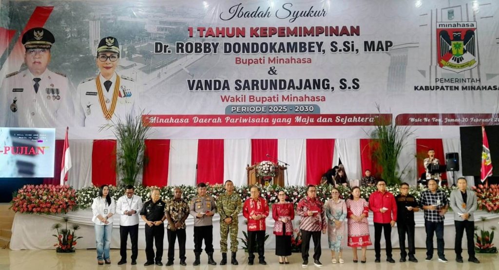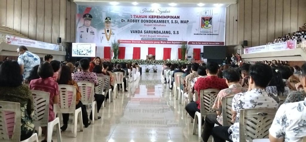 TONDANO, identitasnews.id — Pemkab Minahasa menggelar ibadah syukur 1 Tahun Kepemimpinan Bupati Minahasa Dr. Robby Dondokambey S.Si, MAP (RD) dan Wakil Bupati (Wabup) Minahasa Vanda Sarundajang S.S (Vasung), periode 2025-2030, bertempat di Gedung Wale Ne Tou, Tondano, Jumat (20/2/2026).