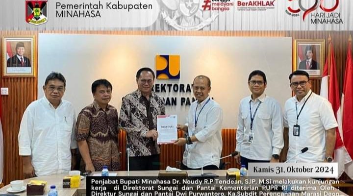 TONDANO, identitasnews.id – Penjabat Bupati Minahasa Dr.Noudy R.P Tendean, S.IP, M.Si, melakukan kunjungan kerja (Kuker) di Direktorat Sungai dan Pantai Kementerian PUPR RI dan diterima oleh Direktur Sungai dan Pantai Dwi Purwantoro, Ka.Subdit Perencanaan Marasi Deon,