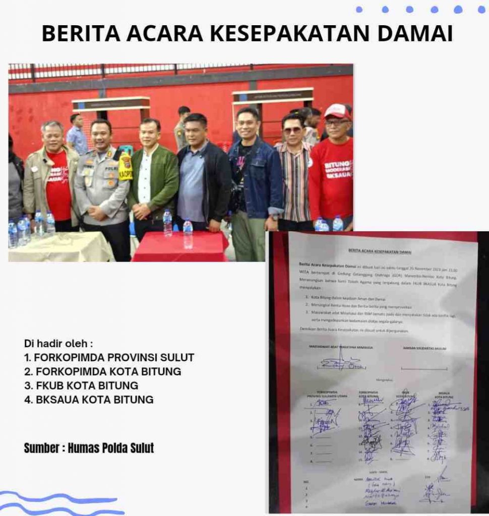 “Dukung pelaksanaan tugas baik dari TNI, Polri maupun Pemerintah Kota Bitung, untuk menjaga situasi ini, tidak hanya masyarakat termasuk juga para tokoh adat, tokoh agama dan tokoh masyarakat, Di buktikan bahwa, kemarin malam sudah dilakukan pertemuan dan sudah ada komitmen serta kesepakatan untuk tidak memperpanjang masalah ini. “kemudian mempercayakan proses dalam penyelesaian ini, dilakukan secara prosedur hukum,” Jelas Kapolda Sulut.