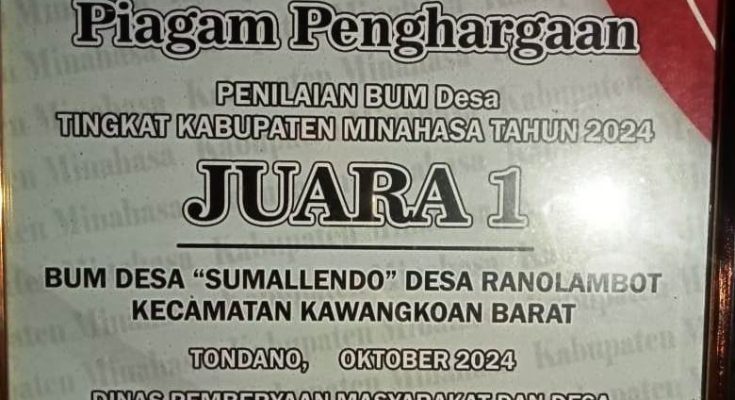 KAWANGKOAN, identitasnews.id – Badan Usaha Milik Desa (Bum Des) Sumallendo Desa Ranolambot Kecamatan Kawangkoan Barat ditetapkan sebagai Pemenang Pertama lomba Bum Des tingkat Kabupaten Minahasa 2024.