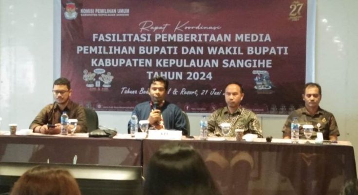 SANGIHE.Identitasnews.id – Dalam memaksimalkan sosialisasi tahapan Pemilihan Kepala Daerah dan Wakil Kepala Daerah (Pilkada) Tahun 2024 di Kabupaten Kepulauan Sangihe khususnya untuk Pemilihan Bupati dan Wakil Bupati, Komisi Pemilihan Umum (KPU) Kabupaten Kepulauan Sangihe menggelar Rapat Koordinasi (Rakor) bersama insan pers bertempat di Tahuna Beach Hotel and Resort, Jumat (21/06/2024).
