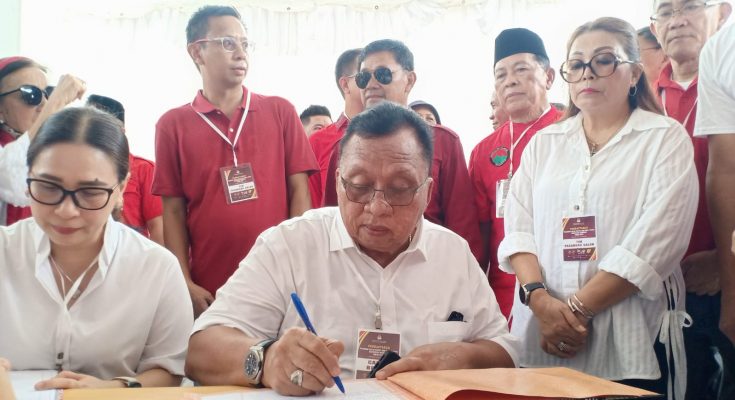 TONDANO, identitasnews.id – Partai Demokrasi Indonesia Perjuangan (PDIP) Minahasa mendaftarkan dua kader terbaiknya sebagai Calon Bupati Robby Dondokambey (RD) dan Calon Wakil Bupati Vanda Sarundajang (Vasung) ke Komisi Pemilihan Umum (KPU) Minahasa, Kamis (29/8/2024).