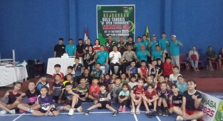 KAWANGKOAN, identitasnews.id – Camat Kawangkoan Utara Fabian Mendur S.Pt MM, atas nama pemkab Minahasa, membuka secara resmi kejuaraan open Tournament Bulu Tangkis Minahasa Cup 2025, di GOR Glori-A Kawangkoan, Rabu (8/10/2025).