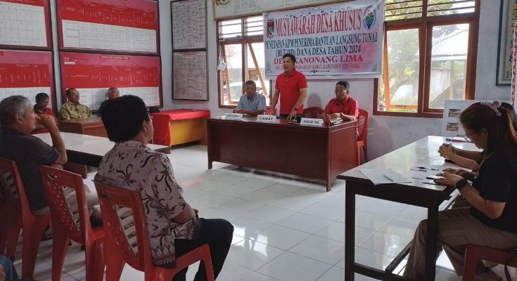 KAWANGKOAN, identitasnews.id – Pemerintah Desa Kanonang Lima bersama pimpinan lembaga desa, mengelar Musyawarah Desa Khusus (Musdesus) Keluarga Penerima Manfaat (KPM) Bantuan Langsung Tunai (BLT) tahun 2024, bertempat di Kantor Desa Kanonang Lima, Jumat (12/1/2024).