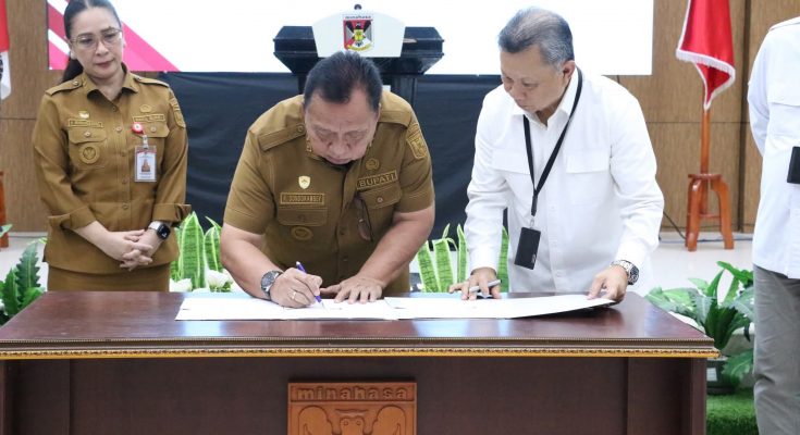 TONDANO, identitasnews.id – Pemerintah Kabupaten Minahasa resmi menjalin kerja sama dengan PT Bank SulutGo melalui Penandatanganan MoU Perjanjian Kerja Sama Komoditi Unggulan, yang dirangkaikan dengan launching program Kredit Usaha Rakyat (KUR) Bohusami.