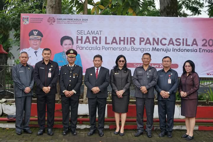 TONDANO, identitasnews.id – Pemerintah Kabupaten (Pemkab) Minahasa menggelar upacara dalam rangka memperingati Hari Lahir Pancasila, 1 Juni 2024, yang ditandai pengibaran Bendera Merah Putih, bertempat di halaman Kantor Bupati, Tondano, Sabtu (1/6/2024).