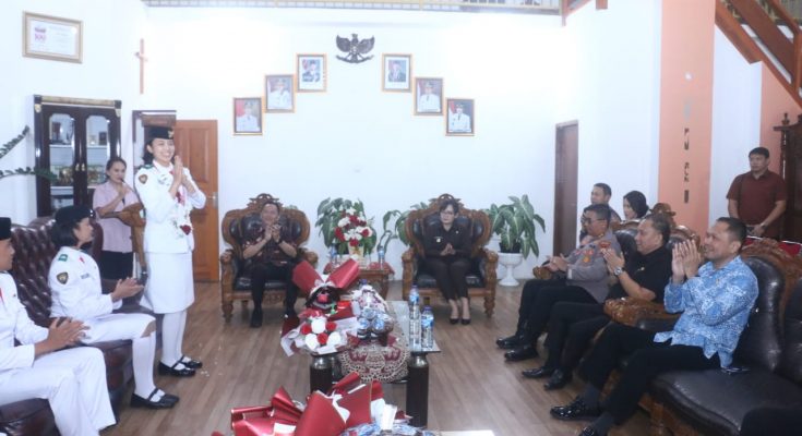 Tomohon – Walikota Tomohon, Caroll Senduk, S.H., bersama Wakil Walikota, Sendy G.A. Rumajar, S.E., M.I.Kom., menyambut kedatangan anggota Paskibraka Tingkat Nasional, Bianca Alessia Christabella Lantang, pembawa Bendera Merah Putih pada Upacara Peringatan HUT ke-80 Republik Indonesia di Jakarta. Penyambutan berlangsung di Kantor Walikota Tomohon, Jumat (22/8/2025).