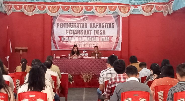 KAWANGKOAN, identitasnews.id – Kabag Tapem Setdakab Minahasa Jenie Sangari MAP, melakukan sosialisasi peningkatan Kapasitas perangkat desa dan kelembagaan desa kecamatan Kawangkoan Utara, di BPU Desa Kiawa Dua, Selasa (14/11/2023).