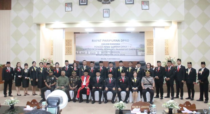 Tomohon – DPRD Kota Tomohon mengelar paripurna dalam rangka Pengucapan Sumpah/Janji Anggota Dewan Perwakilan Rakyat Daerah Kota Tomohon masa jabatan 2024-2029, Selasa (17/9/2024).