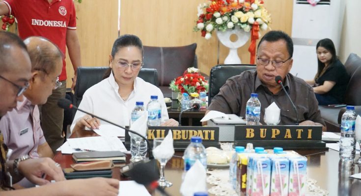 TONDANO, identitasnews.id – Bupati Minahasa, Robby Dondokambey, S.Si, MAP bersama Wakil Bupati Minahasa, Vanda Sarundajang, SS, memimpin Rapat Forum Koordinasi Pimpinan Daerah (FORKOPIMDA) Kabupaten Minahasa yang digelar di Ruang Kerja Bupati, Jumat (8/8/2025).