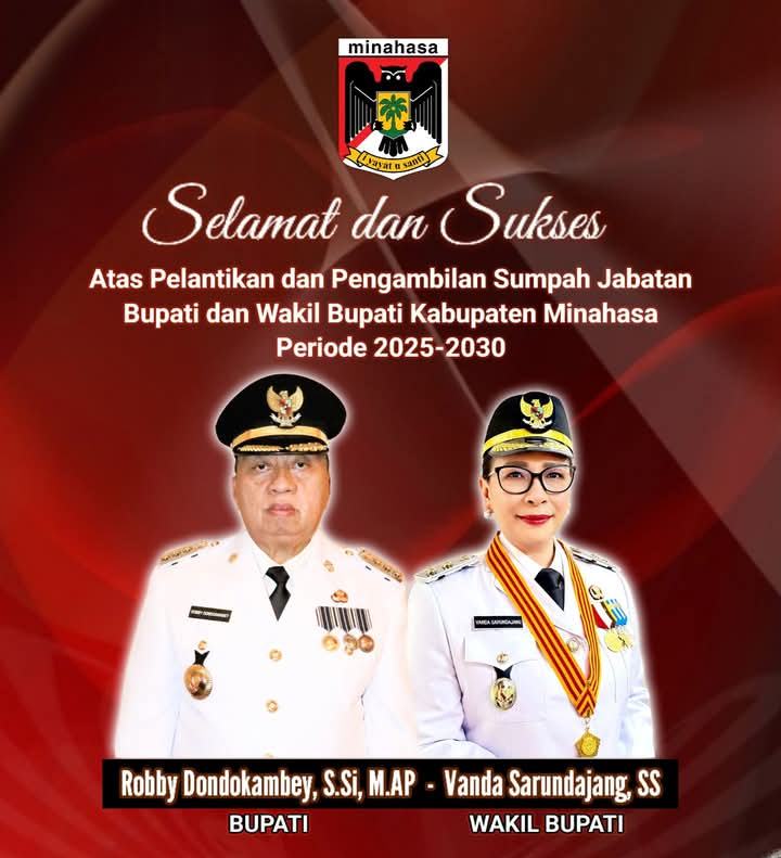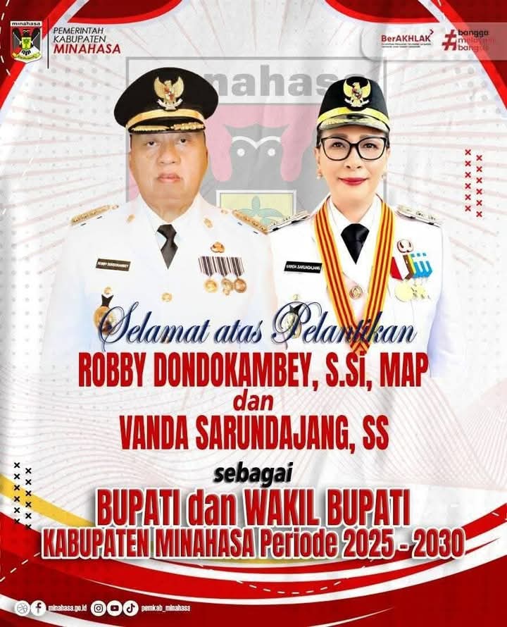Jajaran Pemerintah Kabupaten Minahasa bersama seluruh masyarakat mengucapkan selamat atas pelantikan Robby Dondokambey (RD) dan Vanda Sarundajang (Vasung) sebagai Bupati dan Wakil Bupati Minahasa periode 2025-2030. Keduanya resmi dilantik oleh Presiden Republik Indonesia, Prabowo Subianto, yang digelar di Istana Kepresidenan, Jakarta, pada Kamis, 20 Februari 2025.