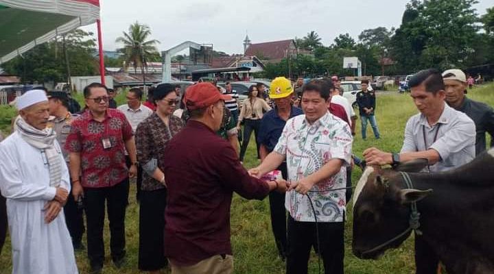 Penyerahan 36 ekor hewan kurban sapi, diserahkan langsung Penjabat Bupati Minahasa Dr Jemmt Stani Kumendong MSi, didampingi Sekda Dr Lynda D Watania MM MSi, yang dilaksanakan di lapangan belakang Kantor Bupati, Sabtu (15/06/2024).