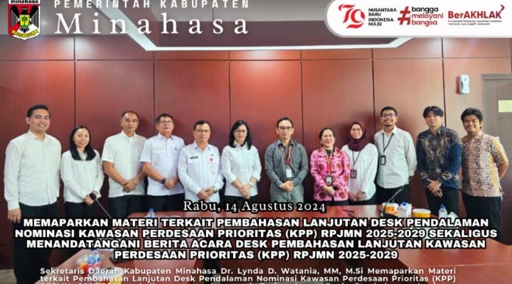 TONDANO, identitasnews.id – Sekretaris Daerah (Sekda) Kabupaten Minahasa *Dr.Lynda D. Watania, MM, M. Si, Memaparkan Materi terkait Pembahasan Lanjutan Desk Pendalaman Nominasi Kawasan Perdesaan Prioritas (KPP) RPJMN 2025-2029 sekaligus menandatangani Berita Acara Desk Pembahasan Lanjutan Kawasan Perdesaan Prioritas (KPP) RPJMN 2025-2029 di Kementerian Perencanaan Pembangunan Nasional/ Badan Perencanaan Pembangunan Nasional (Bappenas) Republik Indonesia, Rabu (14/8/2024).