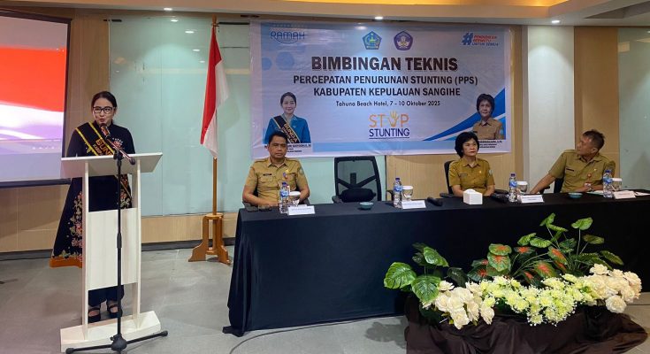 SANGIHE.Identitasnews.id – Bunda PAUD Kabupaten Kepulauan Sangihe Ny. Cherry S. Thungari Soeyoenus, SE memberikan dukungan penuh terhadap upaya pencegahan Stunting melalui kegiatan Bimbingan Teknis (Bimtek) Percepatan Penurunan Stunting (PPS) bagi Tenaga Pendidik Pendidikan Anak Usia Dini (PAUD) yang digelar oleh Dinas Pendidikan dan Kebudayaan Daerah, Selasa (07/10/2025).