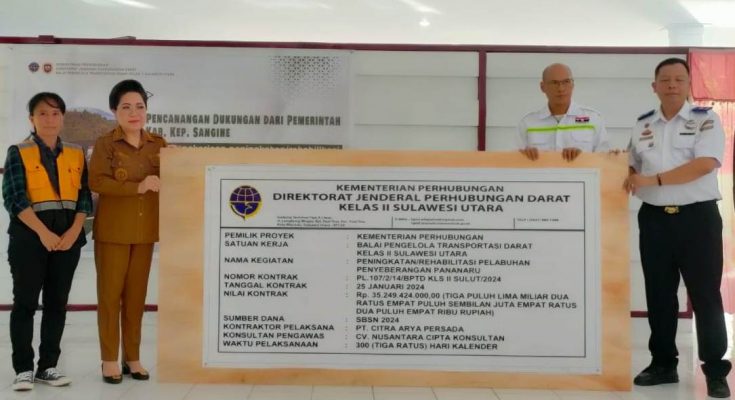 SANGIHE.Identitasnews.id – Penjabat Bupati Kepulauan Sangihe dr. Rinny Tamuntuan mendukung sepenuhnya peningkatan/rehabilitasi Pelabuhan Penyeberangan Pananaru ketika menghadiri pencanangan dukungan dari Pemerintah Kabupaten Kepulauan Sangihe terkait pekerjaan peningkatan/rehabilitasi Pelabuhan Penyeberangan Pananaru, Senin (22/04/2024).