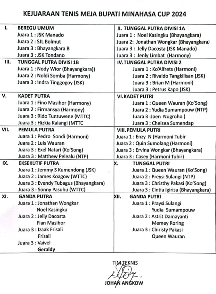 “Keberhasilan panitia ini juga tidak lepas dari dukungan dan suport Dinas Olahraga Kabupaten Minahasa yang dipimpin Dr. Arody Tangkere MAP, selaku kepala dinas dan seluruh jajaran yang ada,” ujar Melky sembari berharap Kejuaraan ini dilaksanakan terus menerus demi memotivasi para atlit di Sulawesi Utara terlebih khusus cabang tenis meja.