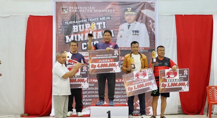 TONDANO, identitasnews.id- Pelaksanaan Kejuaraan Tenis Meja tingkat Kabupaten Minahasa yang digelar tanggal 26-28 Juli dan dilanjutkan dengan Open Turnamen Tenis Meja Bupati Minahasa Cup pada tanggal 1-3 Agustus yang diikuti ratusan atlit berbagai Perkumpulan Tenis Meja (PTM) dari kabupaten/kota se-Sulawesi Utara sukses dihelat di gedung Wale Ne Tou Tondano.