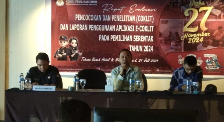 Di Kabupaten Kepulauan Sangihe, KPU menggelar Rapat Evaluasi Pencocokan dan Penelitian (Coklit) dan Laporan Penggunaan Aplikasi E-Coklit pada Pemilihan Serentak Tahun 2024 bagi Ketua dan Anggota Panitia Pemilihan Kecamatan (PPK) se-Kabupaten Kepulauan Sangihe.