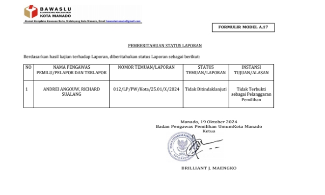 “Berdasarkan hasil kajian terhadap laporan, diberitahukan status Laporan adalah Tidak Ditindaklanjuti dengan alasan Tidak Terbukti sebagai Pelanggaran Pemilihan,” begitu isi surat yang ditandatangani oleh ketua Bawaslu Manado, Briliant Maengko tertanggal 19 Oktober 2024, yang diterima media ini pada, Minggu (20/10/2024) sore.