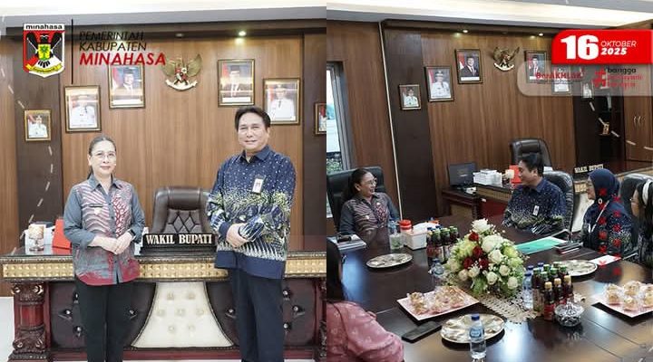 TONDANO, identitasnews.id – Wakil Bupati Minahasa, Vanda Sarundajang, SS (Vasung) menerima juga kunjungan Kepala Balai POM Sulut, Hermanto, S.Si., Apt, MPPM bersama jajaran, di ruang kerja Wakil Bupati Minahasa, Kamis (16/10/2025).