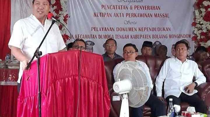 Bupati bolmong ir.Limi mokodompit MM dalam sambutannya sangat berterima kasih pada Wakil gubernur Drs.OE Kandouw karena di tengah kesibukan masih sempat berkunjung dalam kegiatan kawin masal dan perekaman KTP di Bolmong. Bupati juga berterima kasih kepada Calon- calon kawin masal karena sudah membuat Akta kawin, begitu juga Dinas Kependudukan dan pencatatan Sipil yang sudah melaksanakan tugas dengan baik untuk masyarakat di Bolaang mongondow. Begitu juga untuk Kawin masal kisaran seratus (100) kepala keluarga yang telah mendapatkan Surat Akta Nikah.